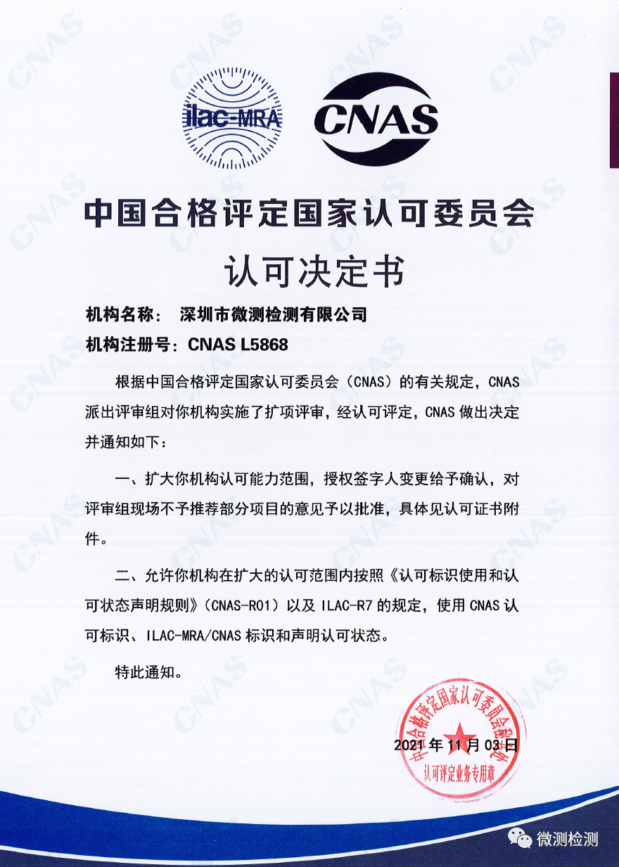 喜訊!微測(cè)檢測(cè)順利通過(guò)CNAS擴(kuò)項(xiàng)評(píng)審,并于2021年11月初收到了中國(guó)合格評(píng)定國(guó)家認(rèn)可委員會(huì)(以下簡(jiǎn)稱“CNAS”)擴(kuò)項(xiàng)認(rèn)可決定書(shū)。